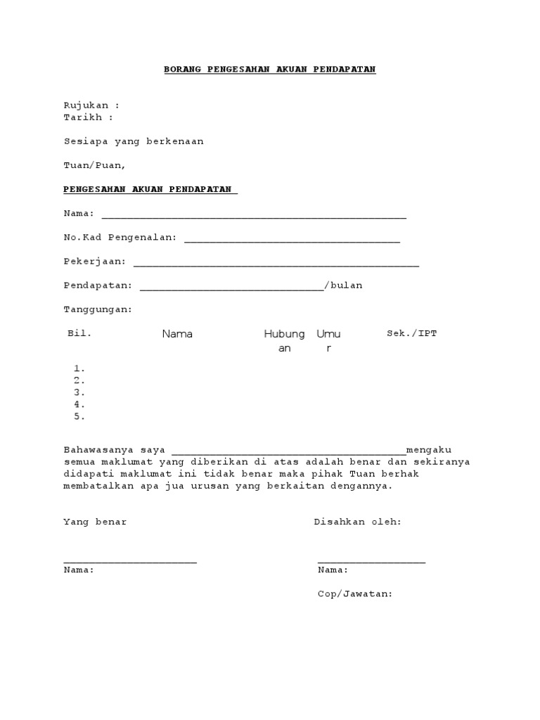 Surat Pengesahan Pendapatan from imgv2-2-f.scribdassets.com Anda boleh dapatkan surat akuan pengesahan pendapatan di bawah. Contoh surat akuan pendapatan sendiri surat akuan pengesahan pendapatan adalah khusus buat individu yang bekerja sendiri dan tidak mempunyai slip gaji. Contoh surat kuasa yang benar dan turorial lengkap cara membuatnya. Anda perlu memohon surat pengesahan daripada pihak majikan sebagai bukti atau butiran yang mengesahkan jawatan anda di sesebuah syarikat. Contoh surat pengesahan majikan dan jawatan (ringkas & mudah). Surat kuasa pem gaji contoh majikan tulisan proposal borang permohonan kemudahan tambang percuma mengunjungi keberatan faktur pembayaran sederhana. Contoh surat pengesahan pendapatan bagi individu yang tidak mempunyai slip gaji. Contextual translation of surat pengesahan gaji into english.